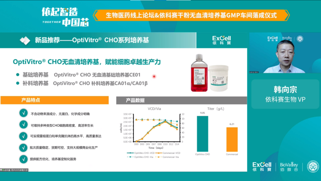 2022年6月18日,“依起智造·中國(guó)芯”生物醫(yī)藥線(xiàn)上論壇&依科賽干粉無(wú)血清培養(yǎng)基GMP車(chē)間落成儀式圓滿(mǎn)舉行。中科院院士裴鋼、IBT聯(lián)合創(chuàng)始人周新華、恒瑞醫(yī)藥VP 陶維康、天廣實(shí)VP 葉培、科望生物VP 王冠驊、依科賽生物董事長(zhǎng) 陳旭、依科賽生物CEO 張昆、依科賽生物VP 韓向宗出席本次活動(dòng),通過(guò)線(xiàn)上直播,共話(huà)行業(yè)新技術(shù),共論產(chǎn)業(yè)新機(jī)遇,共同見(jiàn)證依科賽干粉無(wú)血清培養(yǎng)基GMP車(chē)間正式落成的璀璨時(shí)刻。