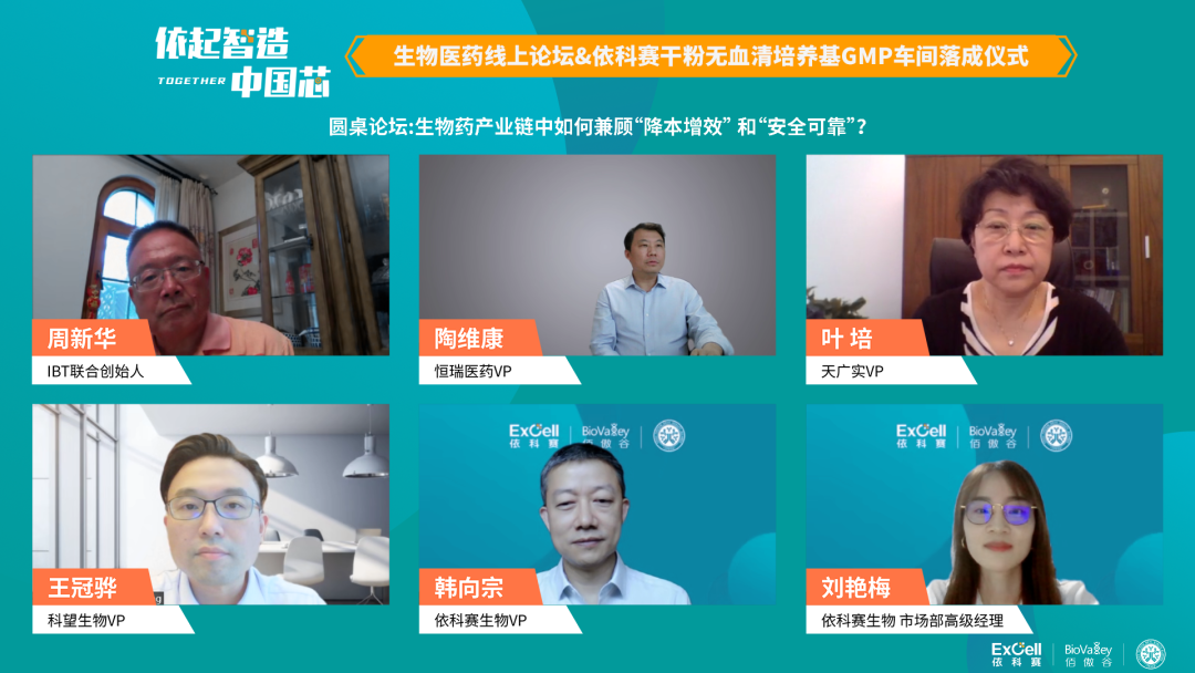圓桌論壇環(huán)節(jié),各位嘉賓都是行業(yè)領(lǐng)域內(nèi)的佼佼者,此次圓桌可謂是行業(yè)大拿們一次智慧碰撞。本環(huán)節(jié)由依科賽生物市場(chǎng)高級(jí)經(jīng)理劉艷梅主持,參與討論的為IBT聯(lián)合創(chuàng)始人周新華、恒瑞醫(yī)藥VP 陶維康、天廣實(shí)VP 葉培、科望生物VP 王冠驊、依科賽生物VP 韓向宗5位嘉賓,他們以“生物藥產(chǎn)業(yè)鏈中如何兼顧“降本增效” 和“安全可靠”?為主題進(jìn)行探討。期間,與會(huì)嘉賓均肯定了生物醫(yī)藥領(lǐng)域國(guó)產(chǎn)化的必然性及降本增效的迫切性,培養(yǎng)基在生物醫(yī)藥生產(chǎn)中“降本增效”的關(guān)鍵地位以及生物醫(yī)藥上下游分工合作,協(xié)同發(fā)展的重要性。嘉賓們各抒己見(jiàn),妙語(yǔ)頻出、精彩連連,觀點(diǎn)意見(jiàn)更是掀起一場(chǎng)場(chǎng)頭腦風(fēng)暴,引人深思。