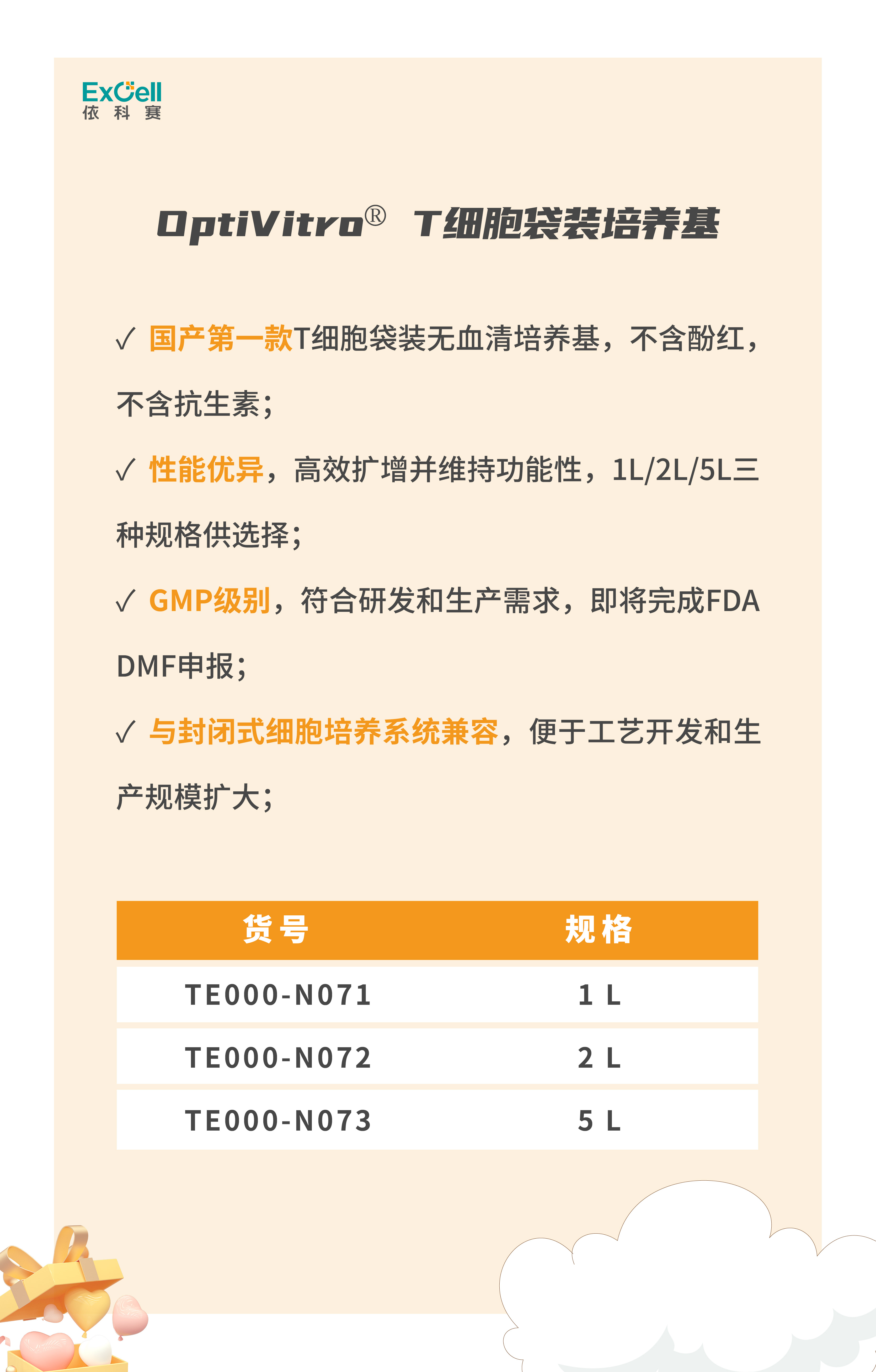 依科賽9月重磅推出T細(xì)胞袋裝無(wú)血清培養(yǎng)基,可以完美適配封閉式細(xì)胞培養(yǎng)方案。