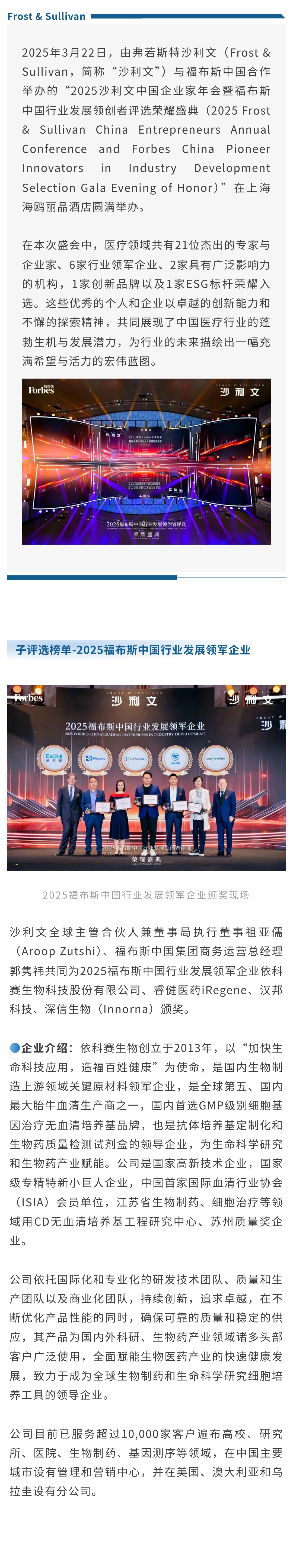 熱烈祝賀依科賽生物榮獲2025福布斯中國行業(yè)發(fā)展領(lǐng)軍企業(yè)